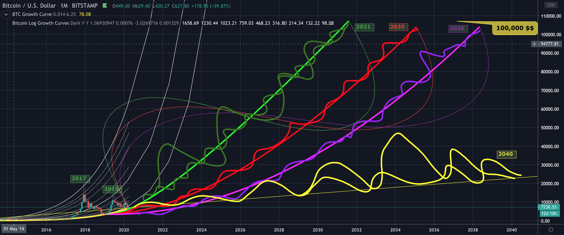 This is the bullish case. Different projections for Bitcoin price to go up to 100,000$ possibly by 2040. In the year 2017, we saw the last all time high (~20,000$). In 2019, we had another peak (~15,000). Due to Corona virus and current economic depression, we will possibly not see great growth until the recession starts to recover. However, all the peaks since the birth of Bitcoin is above the Bitcoin growth curve (yellow line that acts as the supporting base). The thin white lines are Bitcoin logarithmic growth curves which shows exponential growth of Bitcoin price leading to 1 million dollar by that time! However, that is overly optimistic. Bitcoin price is most likely follow the growth patterns shown with the green, red and purple lines. Those lines will reach 100,000$ mark in the year of 2031, 2035, 2038 respectively. And who knows, Bitcoin even can reach a 1 million dollar mark!! These lines may act as support and resistance many many times while keeping the same growth rate over a longer timeframe. This is speculation to persuade new Bitcoin users. Bitcoin only gains as long as it's more used, owned and invested, just like any other assets. The only difference in the case of Bitcoin is that, the growth rate will be much faster as Bitcoin, being decentralized cryptocoin and with a finite supply and with the security provided by the proof of work, is less likely to be manipulated by any entity.