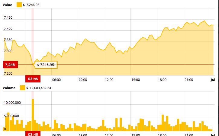The top cryptocurrency is currently trading at $7,426 at press time, up just under 1 percent on the day. Bitcoin saw an intraday low of $7,246.