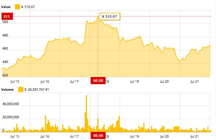 Top altcoin Ethereum (ETH) has seen more significant growth over the past 24 hours, up almost 5 percent and trading at $466 at press time. The altcoin is holding weekly gains of almost 8 percent, peaking at over $500 on July 18.