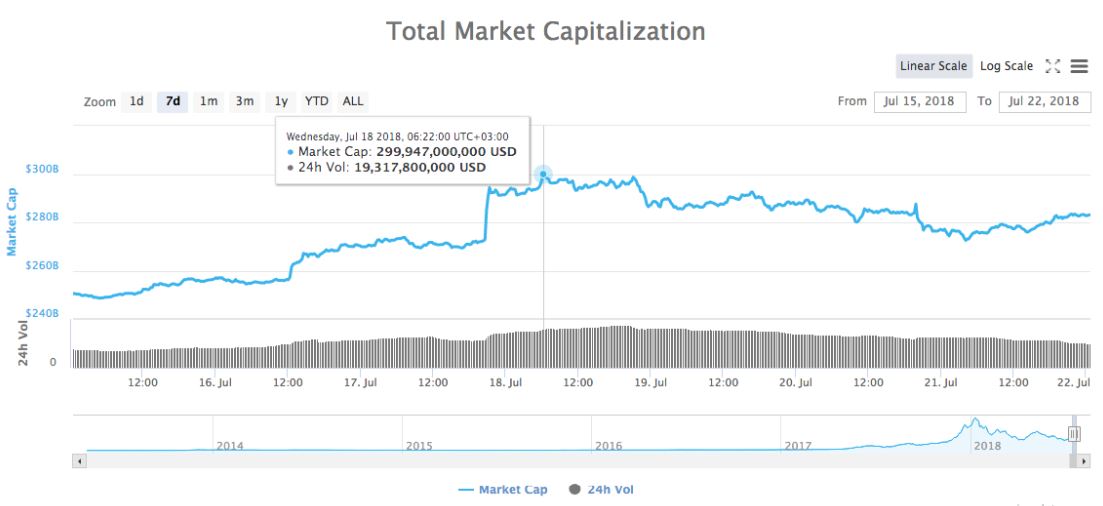 Total market capitalization of all cryptocurrencies is hovering around $282-283 bln, currently at $282.7, up about 2 percent over the past 24 hours to press time. The total market cap is down from this week’s peak of almost $300 bln.