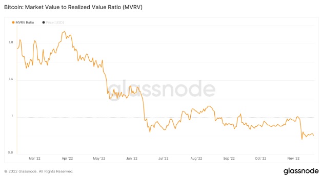 The MVRV has been below 1 for some time. The majority of BTC investors are therefore in loss territory. Source: Glassnode.