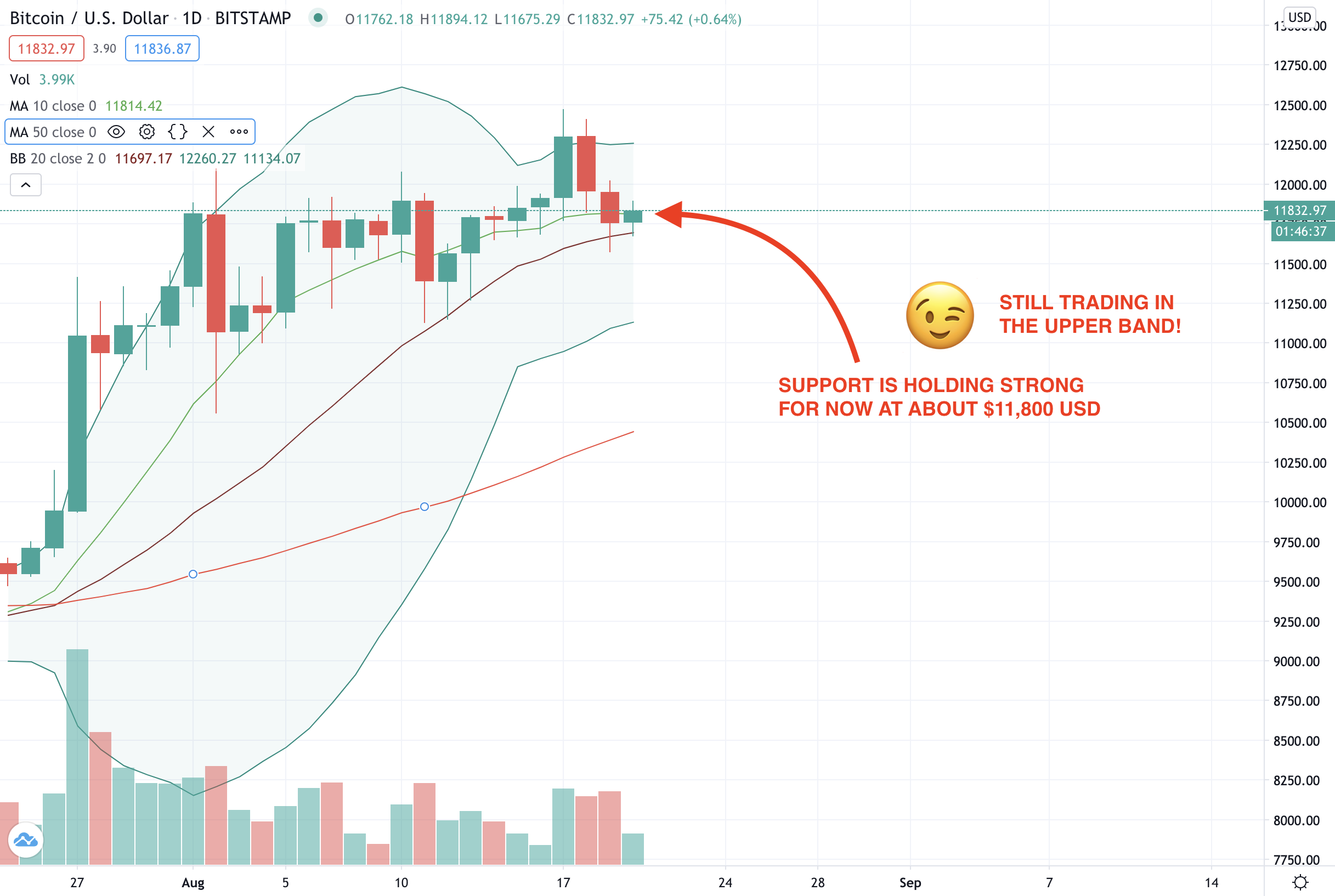 The charts tell a similar story. We're moving sideways for now, holding $11,800. There are still plenty of bullish signals but we have noticed a tiny move in the 10 day moving average starting to dip.