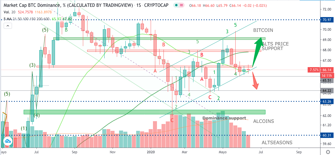 If the dominance of bitcoin breaks the bullish channel downwards due to a slight price correction, after which it lateralizes the value of bitcoin it would allow a rise or recomposition of the price of alcoins.