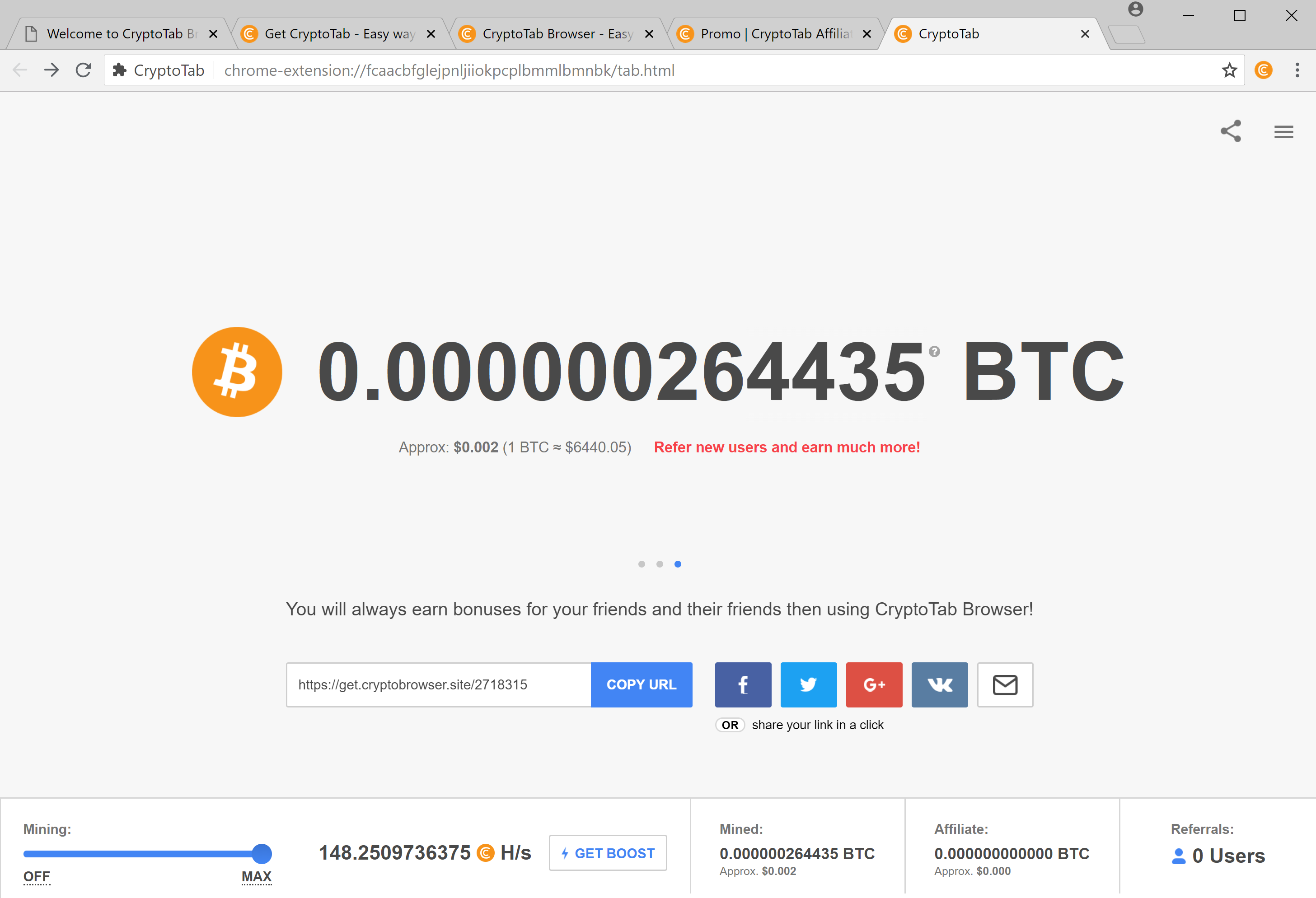 To sum it up, CryptoTab mines Bitcoin on your CPU, during last hour it performed some work and used my CPU. It added a few satoshi into my account balance. After refresh of the balance page was the balance a little bit reduced, which surprised me. Another think to realize is, that till you do not withdraw your reward, coins are not yours, because you do not have private key (they are stored on CryptoTab side). And you should remember that minimal amount which is allowed to withdraw 0.00001 BTC.