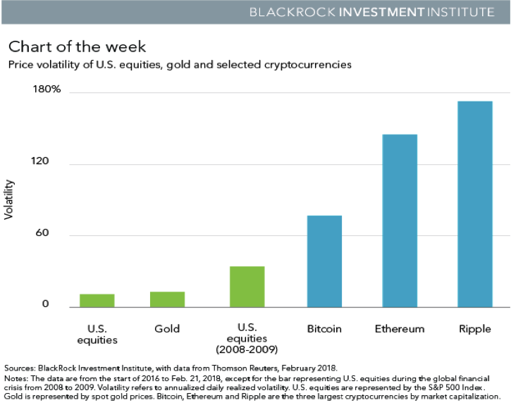 According to a study by the BlackRock Investment Institute, bitcoin is much less volatile than the other two most popular cryptocurrencies on the market, Ethereum and Ripple.
