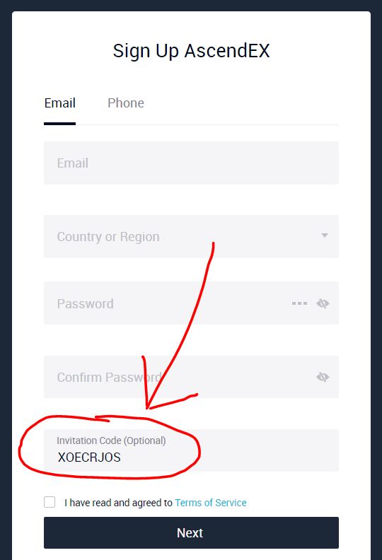 Take advantage of an AscendEX Commission Kickback Rate of -20% commission rate as AscendEX referral bonus, write the AscendEX invitation code XOECRJOS in the field “Invitation Code (Optional)” in the registration form as in the figure below, or easy click the AscendEX ref link https://ascendex.com/register?inviteCode=XOECRJOS for process your registration.