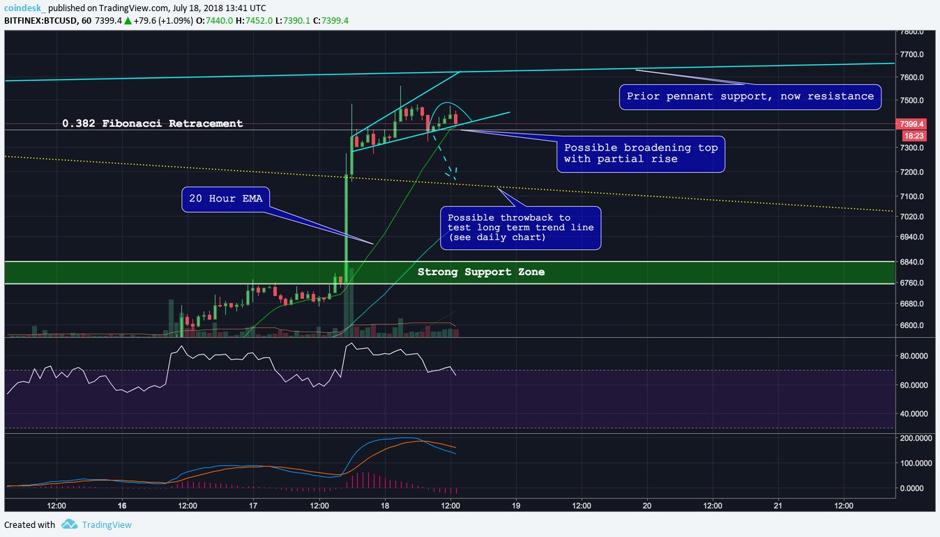 The charts now look overextended & facing resistance- risking pull back to $7000 area as a retest of trendline (yellow)