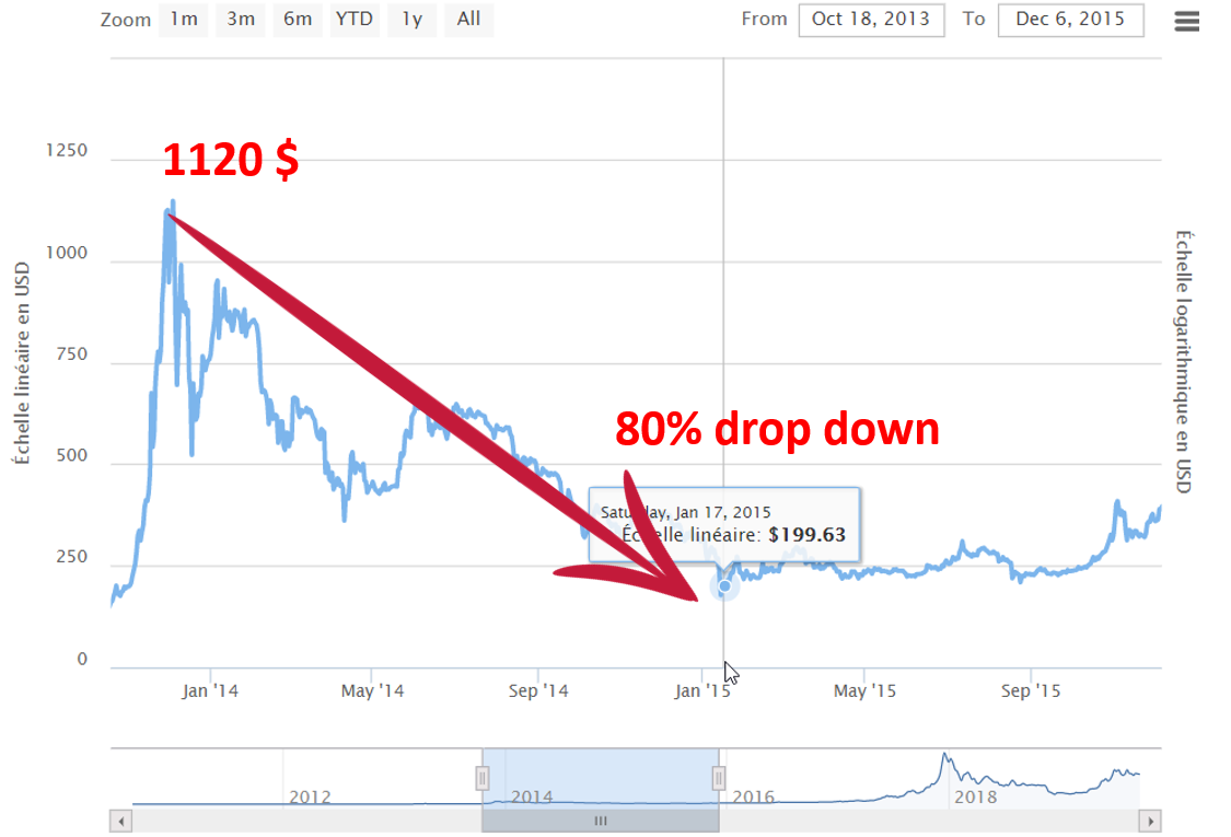 Then Bitcoin drop down 80% from 1120$ to 200$ in 2015.