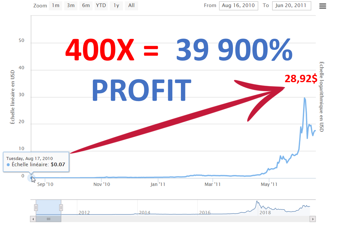 From September 2010 to June 2011 Bitcoin went from 0.07$ to 28$ which was 400X 39 900% profit