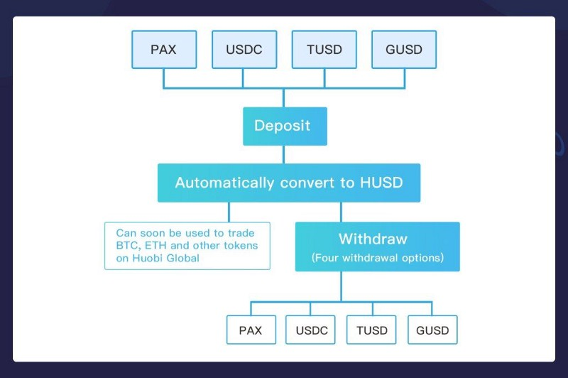 "For example, when you deposit 1 PAX, it will show as 1 HUSD in your account, and you can withdraw 1 TUSD (not considering transaction fees on the blockchain)."
