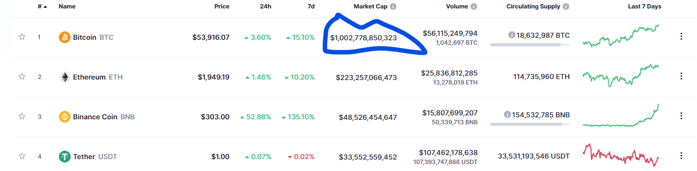 BTC Surpasses US $1 Trillion Market Cap