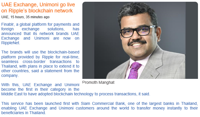UAE의 증권거래소와 국제 외화 환전소 유니모니는 리플의 블록체인 네트워크를 실시간으로 사용한다고 한다.