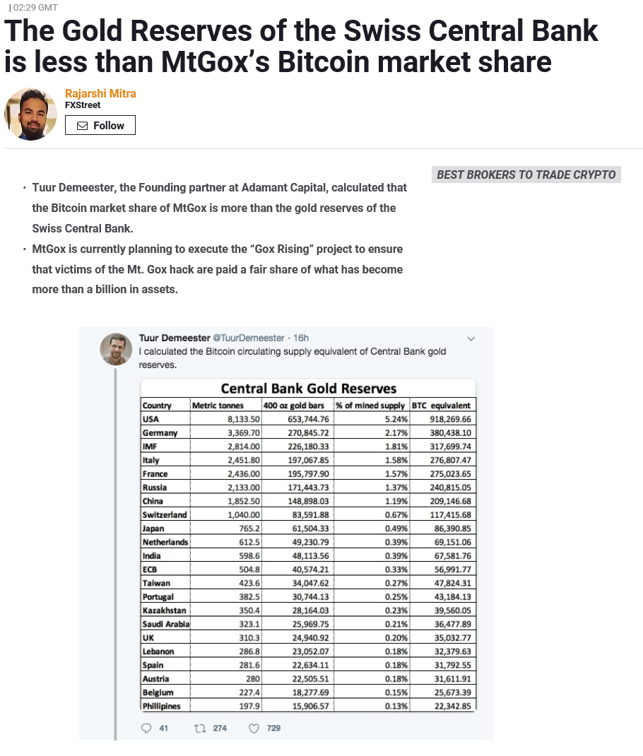 마운트곡스는 현재 131,891 BTC를 보유 하고 있고, 스위스가 보유한 금을 환산하면 약 11만 BTC정도 된다.