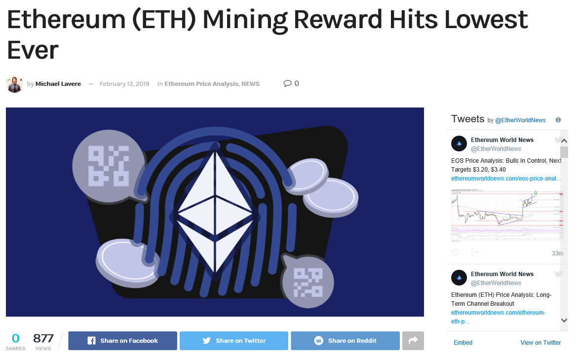 2018년 12월에는 하루에 20,000 ETH가 생성된 반면, 2019년 2월은 13,370ETH 으로 감소했다.