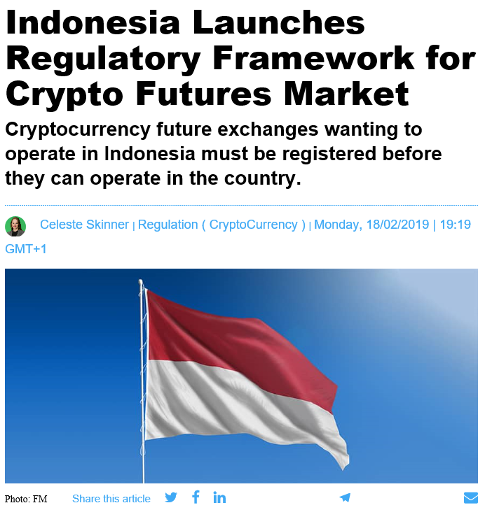 인도네시아에서는 이제부터 암호 화폐 선물 거래는 반드시 현지에서 등록해야 운용할 수 있다고 하며,