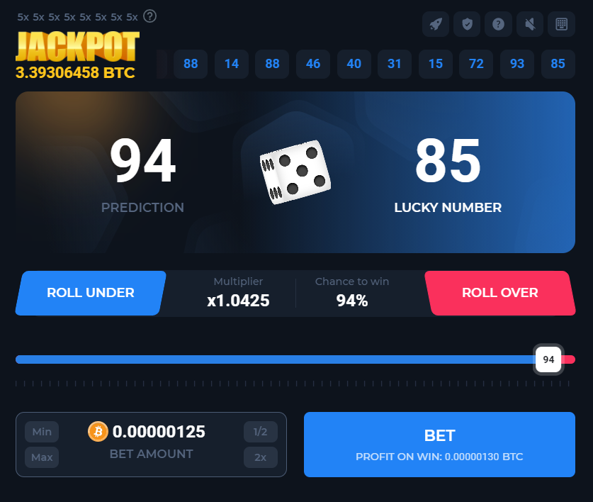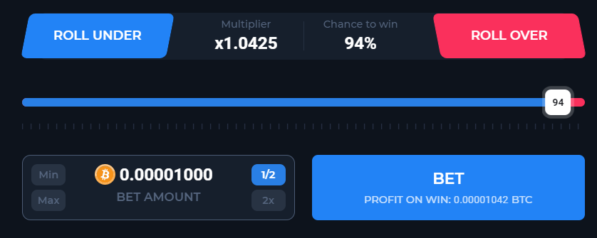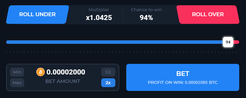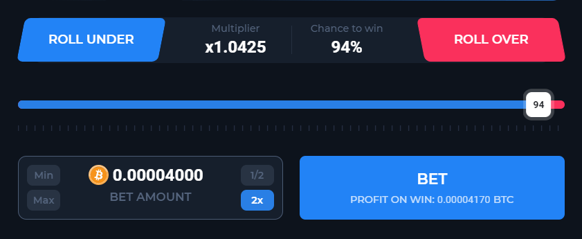 One last method is to switch from 94% to 95% when you lose. This makes it slightly more likely that you will not lose two or three consecutive bets, but your win will be a little smaller. If I lost a 4,000 satoshi bet then I could place a 95% wager on 128,000 sats. It is a bigger risk but you have slightly less chance of losing.