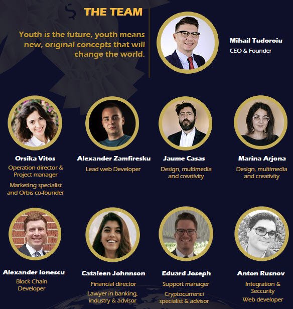 It starts with the Mihail Tudoroiv as CEO and founder. Secondly, we meet Orsika Vitos as Operation Director and Project Manager. Thirdly, we have Alexandru Zamfirescu as Web Developer of the OrbisWeb. Then, we also meet Jaume Casas and Marina Arjona as the Design, Multimedia, and Creativity division.