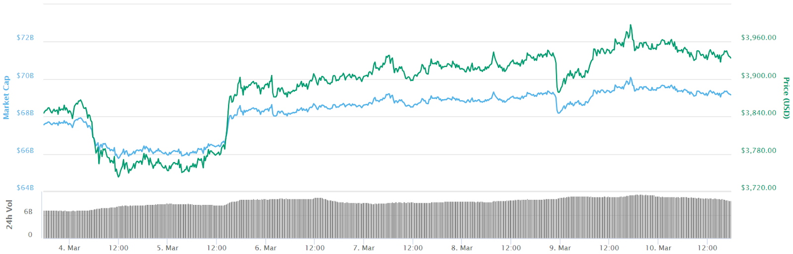 At press time, Bitcoin is down just under 1 percent on the day, trading at around $3,931, according to CoinMarketCap data. Looking at its weekly chart, the current price is over 2 percent higher than $3,845, the price at which Bitcoin started the week.