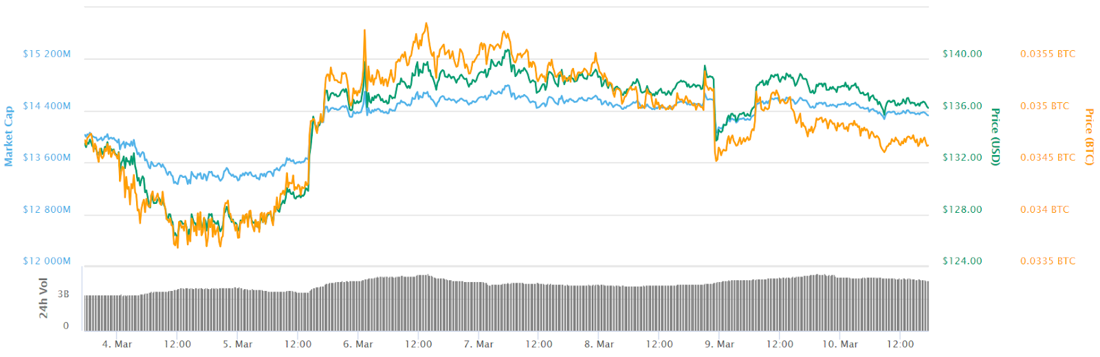 ETH is down by 1.3 percent over the last 24 hours. At press time, ETH is trading around $136, after having started the day around $138. On its weekly chart, Ethereum has seen its value increase by about 2.2 percent from $133, ETH’s price last Saturday.