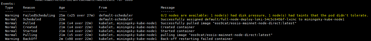 0/2 nodes are available: 1 node(s) had disk pressure, 1 node(s) had taints that the pod didn't tolerate.