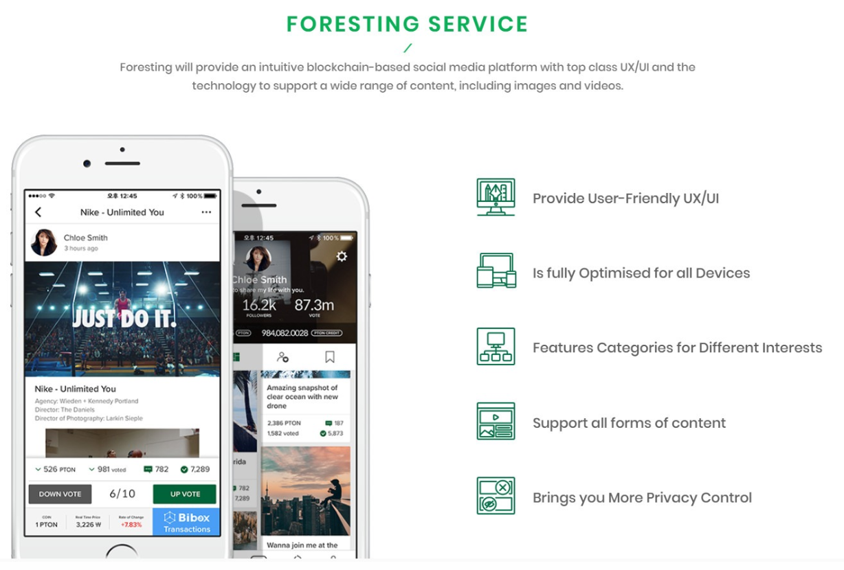 Foresting will provide an intuitive blockchain-based social media platform with top class UX/UI and the technology to support a wide range of content, including images and videos