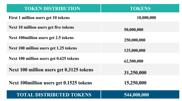 Social distribution of wealth related to user data: Socialchains.io is a decentralized platform of verified users with the aim of distributing the social wealth and adding value to time spent on the social platform. Users will be paid to participate. The first 511 million verified users would get a share of 54.4% of the available 1 billion tokens. The first 1 million users will get 10 (ten) tokens each. The next 10 million users get 5 (five) tokens each, the next 100 million get 2.5 (two and a half) tokens each, the following 100 million get 0.625 (point six two five) tokens and up to 0.3125 (point three one two five) for the future 100 million users. Individuals who verify their identity on the platform using KYC (Know Your Customer) are also awarded points on the platform. The user can exchange the tokens given to fiat or cryptocurrencies. 9 A user can monetize connections within the platform by increasing activity and participate in public forums with other verified users. Socialchains.io not only offers monetary value for user time but also rewards them for the value derived from their data and data generated through platform usage. Users get a share of the platforms profits creating a social economy for the platform's users