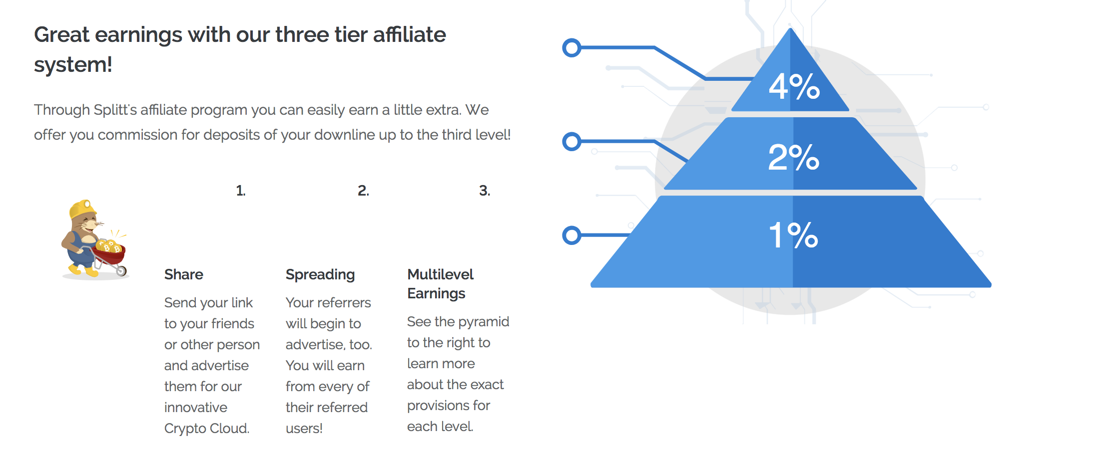 Splitt.co is a new cryptocurrency cloud mining investment site. Affiliate reward is 3 levels deep, paying you 4%, 2%, and 1%. Minimum deposit is 0.001 BTC. Each plan is valid for 35 to 60 days. Check your dashboard for balance every 24 hours to 6 hours based on plans. See the plans for details. Our cryptocurrency mining locations are spread throughout the world, like in Russia, Malaysia, Singapore, Venezuela, Myanmar and many more.
