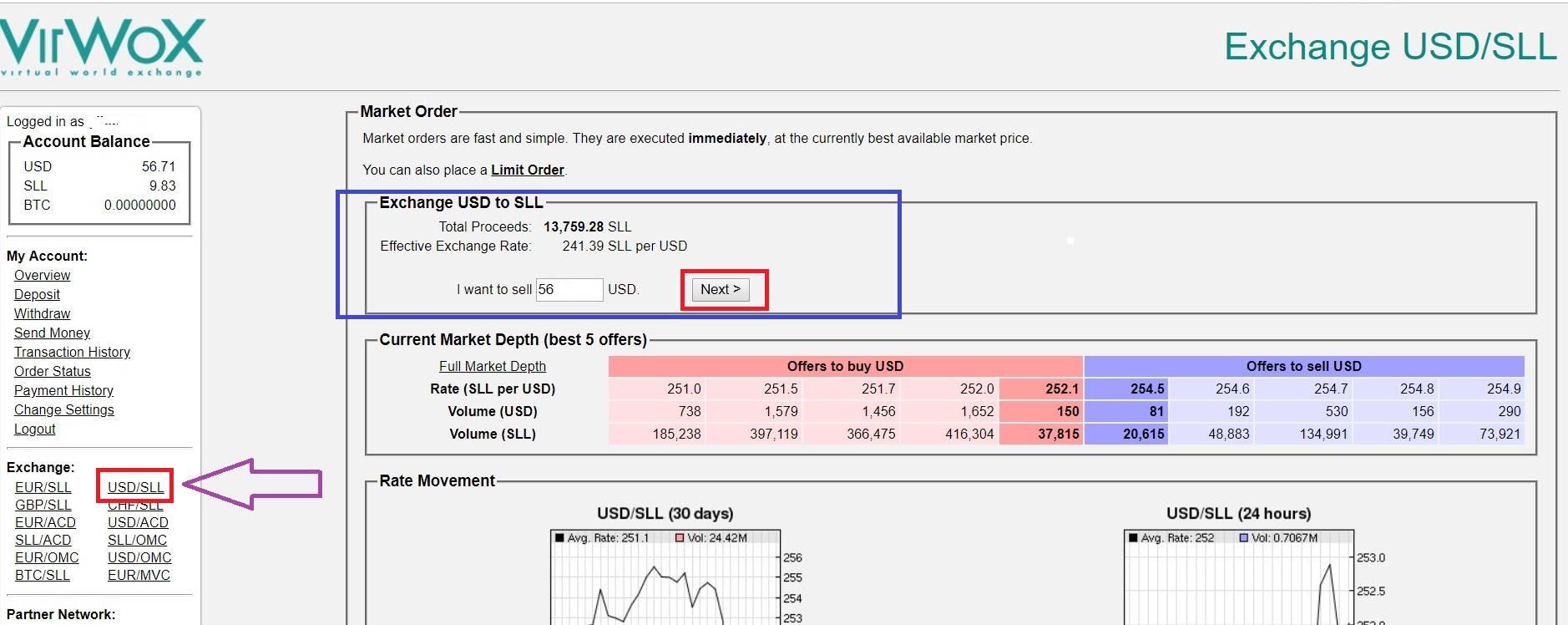 දැන් පහත රූපයේ ආකාරයට USD/SLL බොත්තම ඔබන්න.ඊළගට ඔයාට අවශ්ය USD ගාන ඇතුලත් කරල NEXT බොත්තම ඔබන්න.(සැම විටම USD රවුම් ගානක් ඇතුලත් කරන්න)
