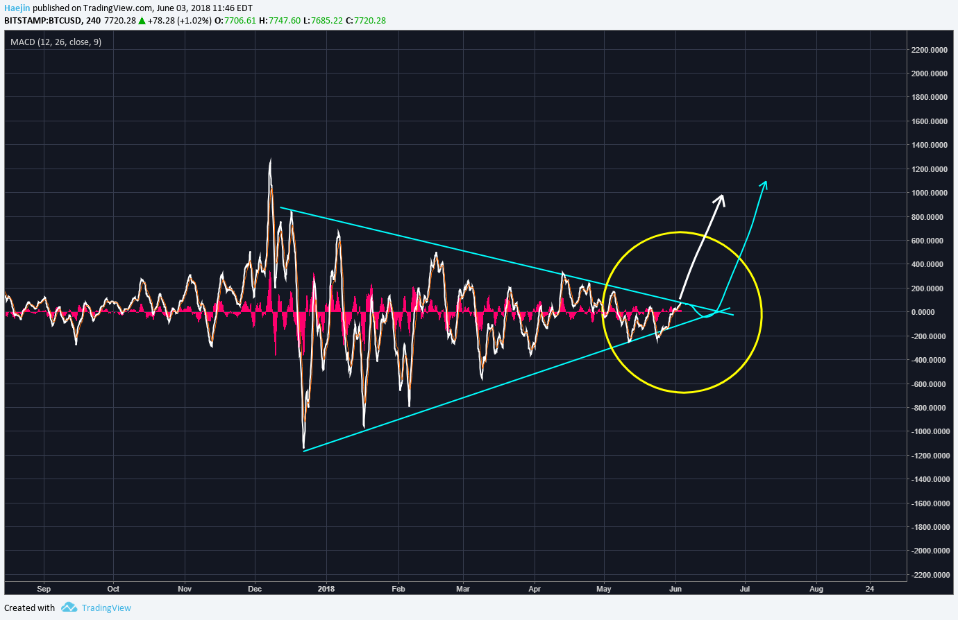 Note how the MACD is at the belly of the upper blue trendline. I believe it could do one more turn down towards the lower blue trendline. This turn in MACD could also mean the $6,700 level or so and IF this occurs, many will whine and panic sell. So, keep this into your awareness because awareness keeps the panic away! The MACD will be that much more proximal to the apex. How would this impact the long term outcome? None.