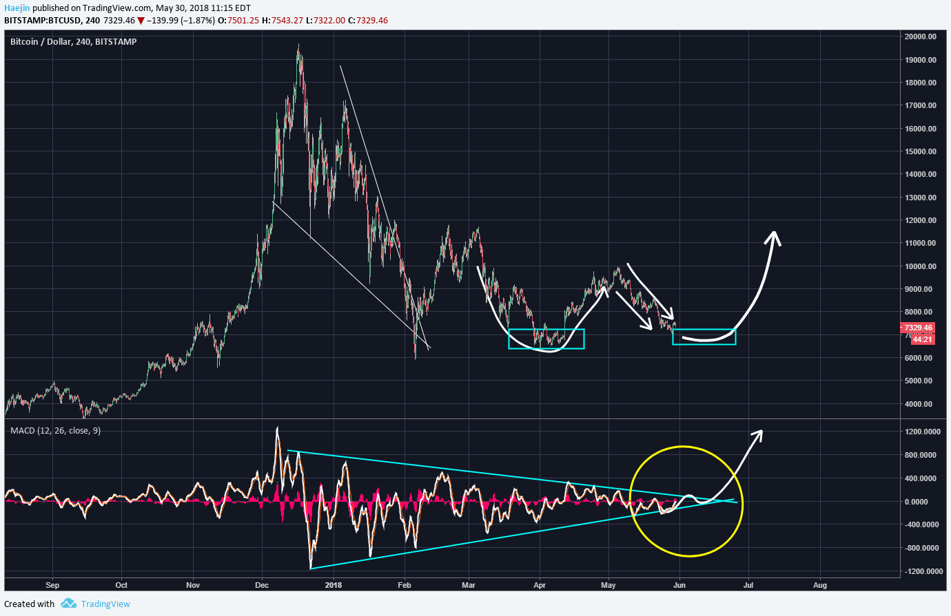 On a near daily scale, the bull wedge and the Cup & Handle potential still remain valid and in progress. However, there might be a potential for a second rounded price formation. IF that is the case, the basin phase might occur (blue rectangle) as it did for the first fractal. This should allow the MACD to wiggle a bit more closer to the apex.