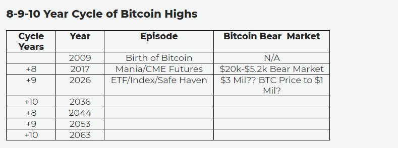 The Benner cycle was explained in detail on this Steemit post. It explained in detail the 8, 9, 10 year cycle highs as shown in the below chart: