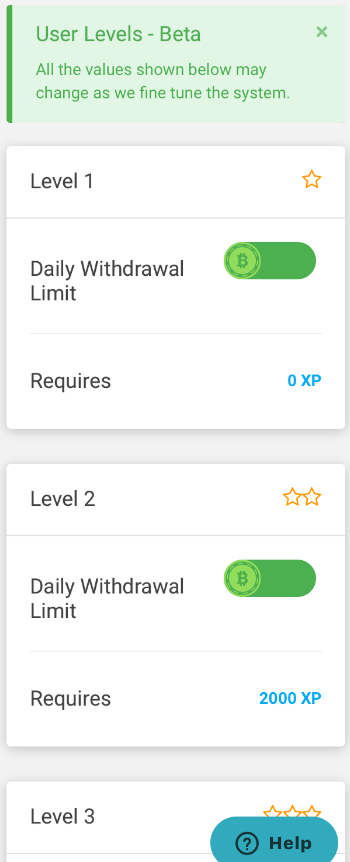 Okay, well it’s pretty simple. The levels are thresholds to how much you can withdraw. See although there is no minimum on withdraws, there are limits on how much you can withdraw at a time. So level one (the entry level) is a maximum of 1000 Satoshi.