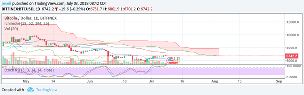 This is a daily chart of Bitcoin’s price action. It is showing bearish trends in all of the Ichimoku indicators. That said, if you’re into the small bumps since we crossed the Tenkan it is pretty likely it will make its way up the Kijun at $7197 IF it does it fast. If it doesn’t make it there by July 23rd it will hit a resistance at the bottom of the cloud first. By August 3rd that cloud resistance falls to where we’re at right now--$6745.