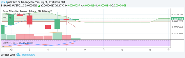 Good news on BAT for me today. We broke through the cloud. The Stoch RSI is also climbing. If the trend continues I will probably sell it on Monday or Tuesday. Definitely a lot sooner than I thought. I may even jump out this afternoon before we hit that kumo twist tomorrow. I should be taking a little bit of profit in doing so.