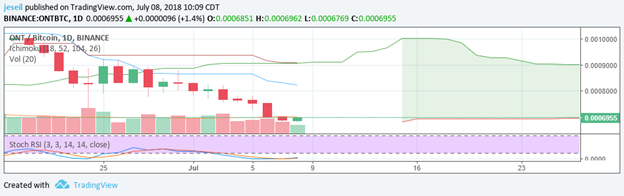 My final buy of the day was some Ontology. The Tenkan and Kijun are showing bearish, but the future kumo cloud is bullish. This one is kind of in my theoretical sweet spot. The Stoch RSI is low, it’s below a bearish Tenkan.