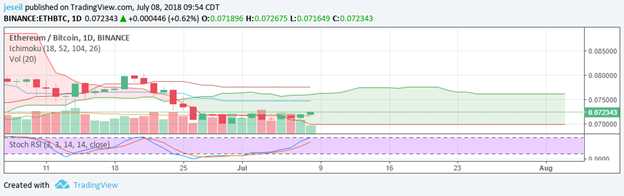 Ethereum is not perfect for me, but it’s definitely good enough to take a chance. The price is not much higher than when the RSI had dipped. I know we’re not really suppose to buy in the cloud, but it’s been in the cloud for two days and is continuing to move in the same direction—towards the Tenkan.
