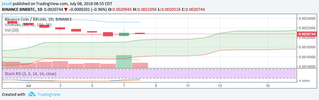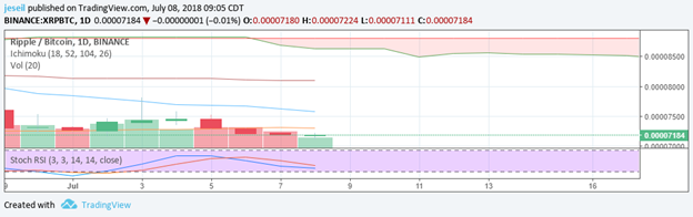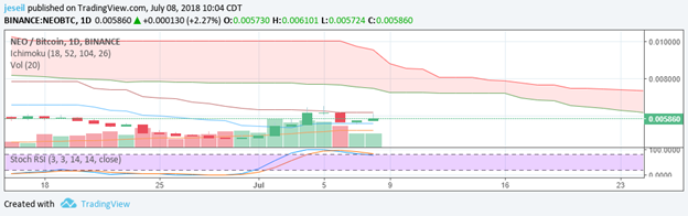 I picked up a small amount of NEO. It’s actually in my sweet spot for everything but the Stoch RSI. I fully expect to hold this one for at least 30 days. The 26 day cloud continues to show bearish. I’m okay with that. For right now, the Tenkan can act as a support.