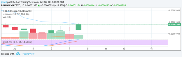QKC could not be at it’s top, BUT it’s high enough for me. Its RSI is high and it’s crossing the Tenkan. I could wait for the absolute top, but I’m not that greedy. I placed a sell order as I’m writing. I bought in two days ago at 0.00001204 BTC and the sell order went through for 0.00001388 BTC. That’s a 15.2% gain. I don’t own much of any of my cryptos, but I’ll take that gain any day of the week.