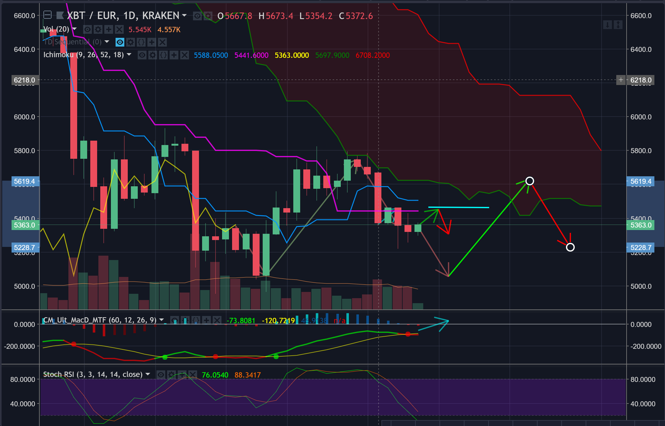 The 1 hour candles have broken through the cloud and there is a bullish tk-cross. however as yet no large bounce away from the cloud as can be expected. This could be due to the heavier resistance of the kumo on the 6hr chart. I would still expect to see the movement along the shorter green arrow to Eur5460 area.