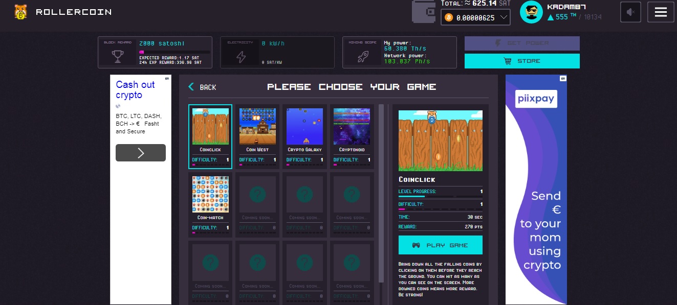 For a long time I have been a user of the BTC mine simulator - Rollercoin.