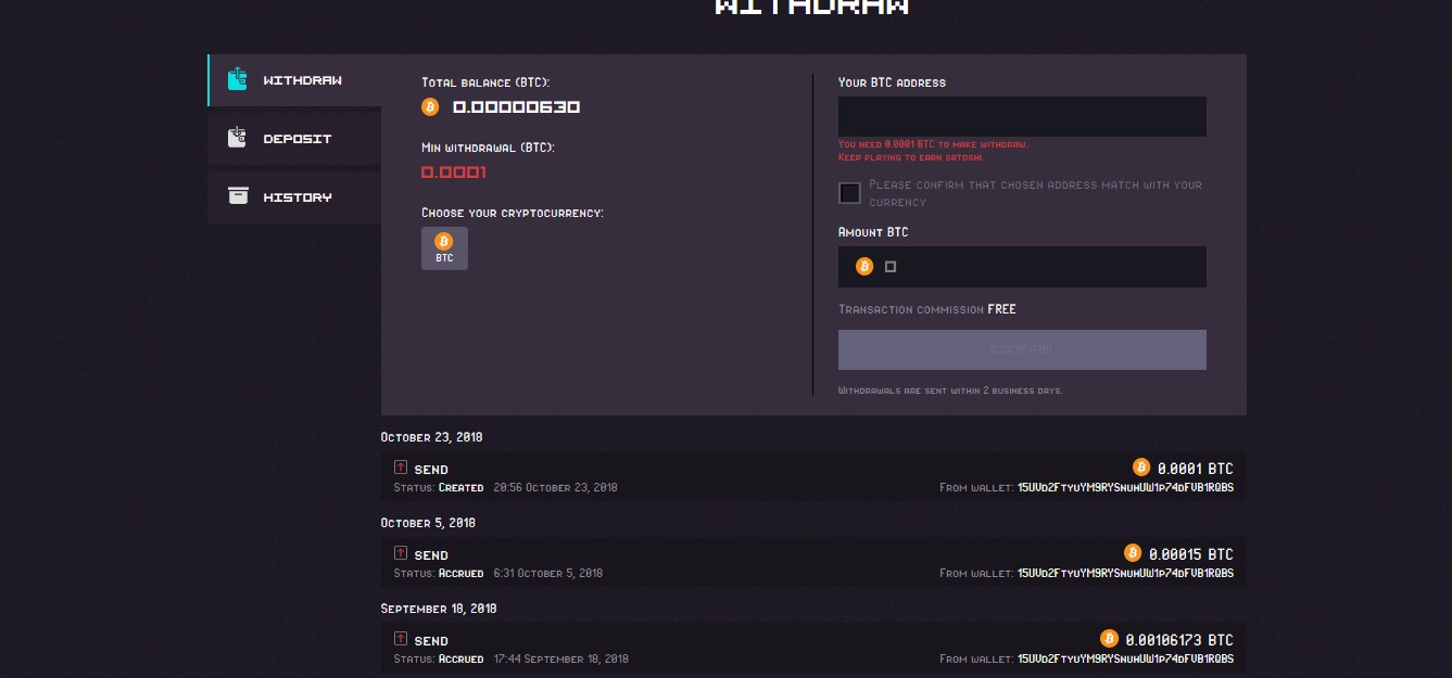 Wypłaty możliwe od 0,0001 BTC (10 000 satoshi).