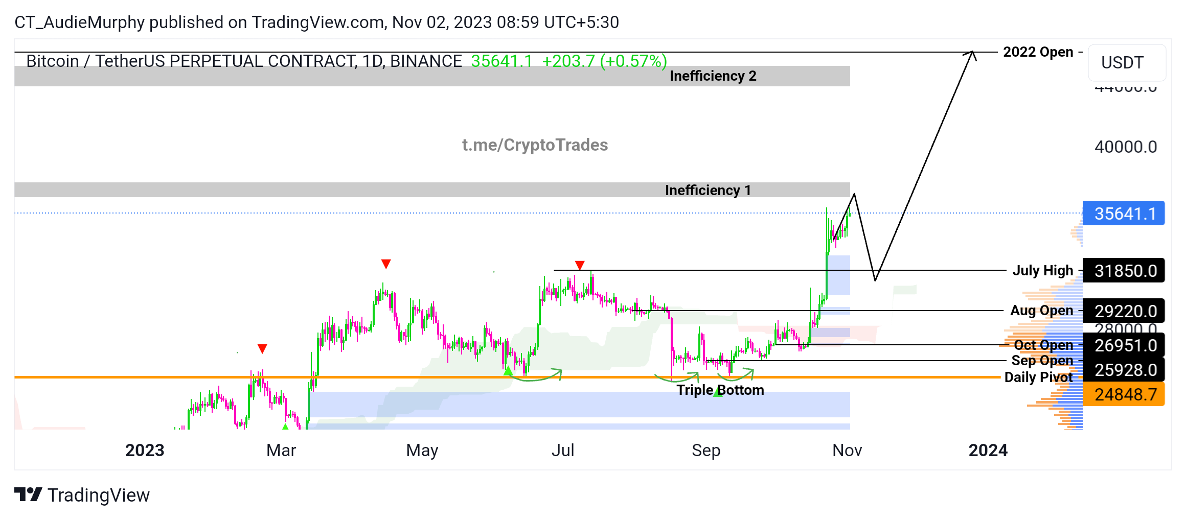 Going forward, CryptoTrades reiterates his outlook for Bitcoin to reach between $36-37k before falling back to retest the key $31k level.