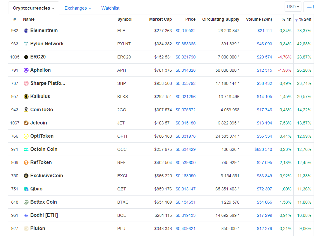 As usual not many known to me here. APH was a NEO DEX but turned it down and got dumped, trades ie KuCoin, EXCL is PoS fork of DASH (seems they kind of went up together here), Pluton used to be Plutus, a fail ICO but seems to be trading ok and i have some of Bodhi from BiBox.