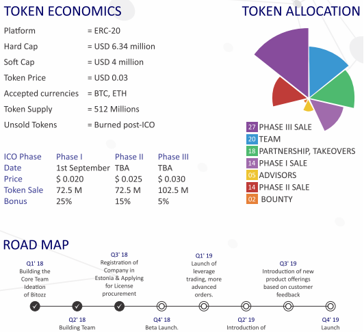 Buy-back plan: Every quarter, we will use 10% of our profits to buy back Bitozz Tokens and burn them, until we buy 59% of all the Bitozz Tokens (302,045,455) back. All buy-back transactions will be announced on the blockchain. We will eventually burn 302,045,455 Bitozz Tokens, leaving 210 Million Bitozz Tokens in circulation. Dividend: Every month, we will distribute on pro-rata basis 10% of our profits (Payable in BTC) to Bitozz Token Holders holding the coin for more than specified days as on the date of distribuon. This practice of distributing bonus will be continued until 31st of December 2022. Referral Income: (Invitation Bonus) becomes payable to a person inviting new users on our plaotform for investing or trading. An incentive of 10% of the amount invested would be given for all direct referrals (5% to be paid in BTC in real time and 5% to be paid in Bitozz Tokens on 30th June 2019). Bitozz tokens as collateral: Bitozz tokens will be accepted as collateral for fiat loans. We have already partnered with Depository Network and in talk with few major fiat loan providers.