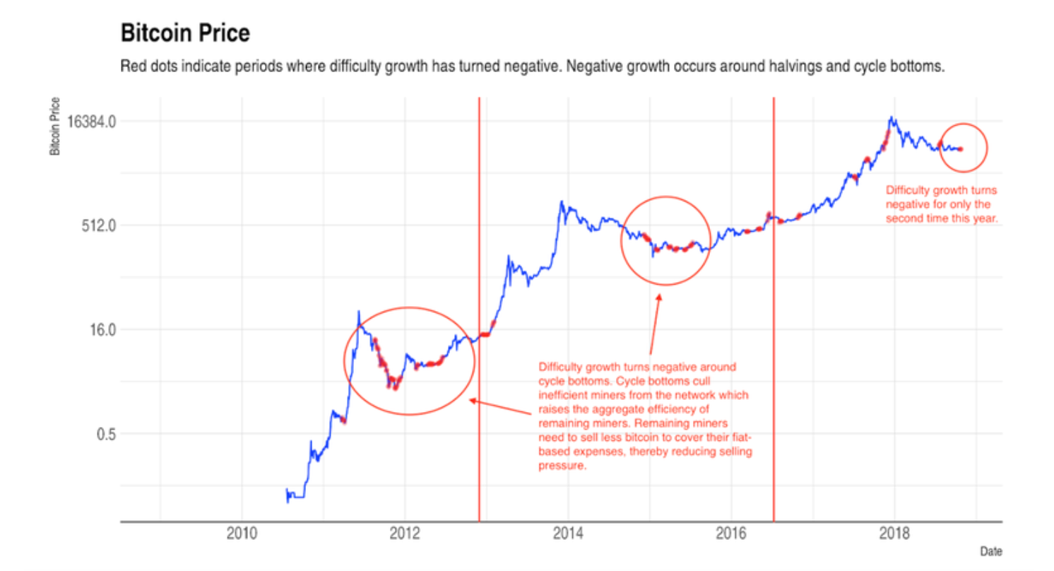 The Element Group which does market research to include crypto has done found an interesting correlation between Bitcoin Mining difficulty and Price action. Since it was created Bitcoin has only actually experienced periods of difficulty dropping 13% of it's entire existence, making it a rare occurrence which they have managed to extract some interesting information from.