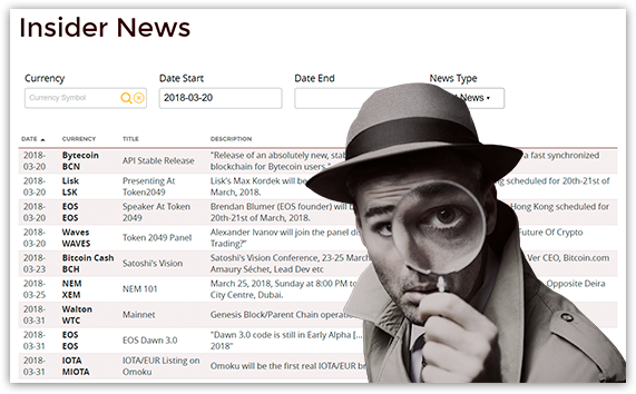 Find out all about upcoming big events, airdrops, big announcements, wallet updates, listings on big exchanges, forks and all other price boosting events.