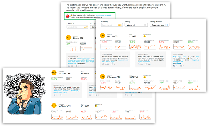 The system automatically gathers the top tweets on each currency and lets you track and analyze the dependency of the price and social media volume. Recent studies have shown that the price of a cryptocurrency directly depends on the social volume and the level of its public interest. You can also set alerts to see which coins get a spike in social volume and Sentiment in the last 24 hours.