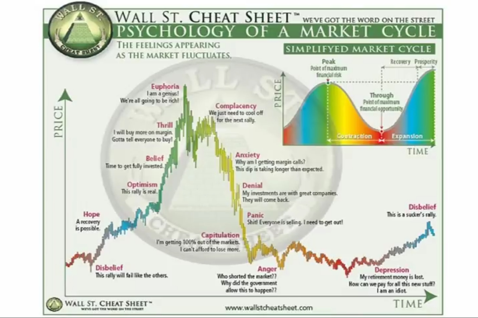 Altro segnare è rappresentato dal famoso grafico di wall street che guarda la psicologia dell’investitore durante uno scoppio di una bolla finanziaria generica, dove si possono vedere tutte le fasi che abbiamo attraversato dallo scorso dicembre in poi; come si vede la somiglianza con il prezzo del bitcoin è piuttosto marcata; troviamo infatti la fase di speranza, ottimismo, euforia, raggiungimento del picco, compiacimento, ansia, panico, rabbia ed infine depressione e rassegnazione che rappresentano il punto minimo prima dell'inizio di un nuovo ciclo.