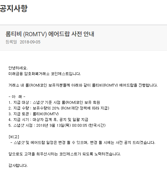 [롬코인은 2018년 9월 현재 "코인제스트" 거래소에 상장되어 있습니다.]