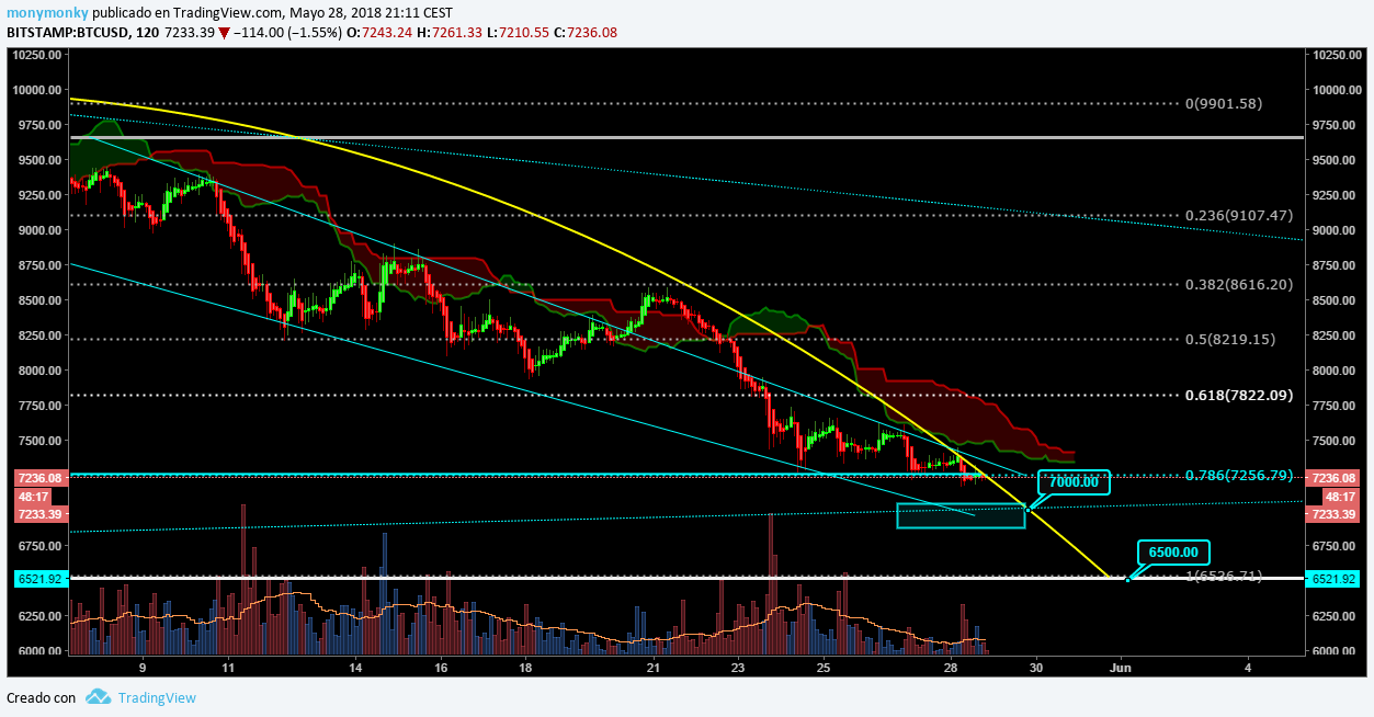 Si Bitcoin quiere salir de ese patrón bajista, va a tener que superar varios puntos muy conflictivos como linea bajista, borde de la cápsula y nube de Ichimoku. En mi opinión lo va a tener bastante complicado para romper al alza y de romper a la baja sus próximos precios serían los $7000 y luego un soporte mas robusto de los $6500 Idea publicada en Trading view dia 8 de mayo 2018 https://es.tradingview.com/chart/BTCUSD/nTEFNpgT/